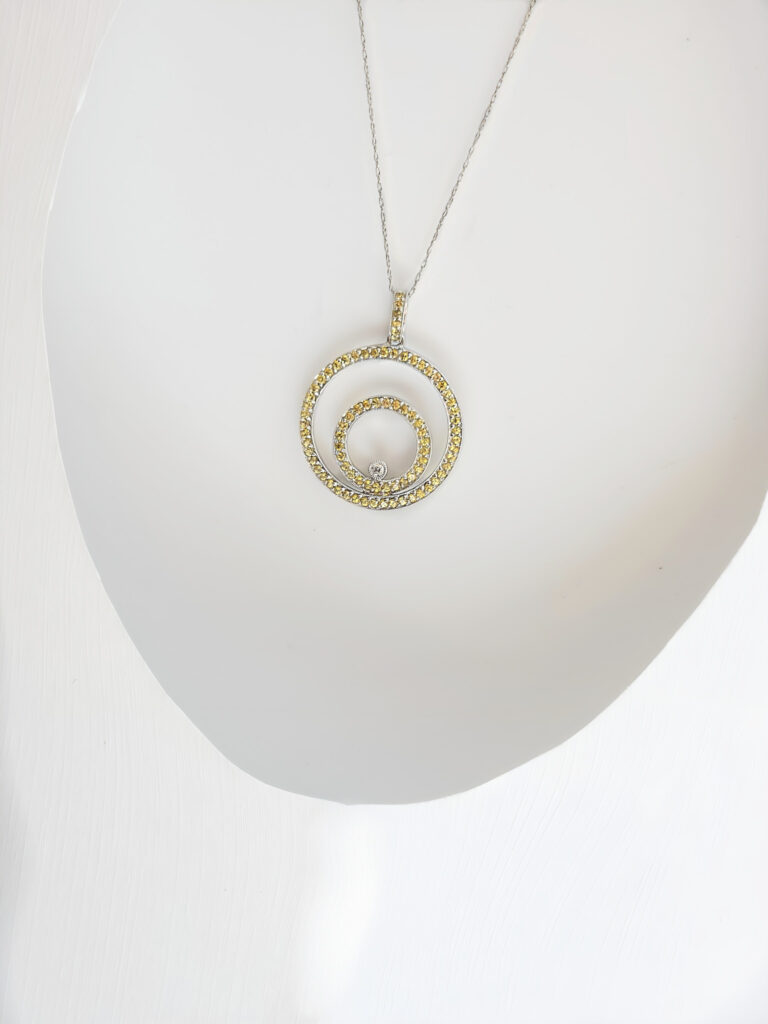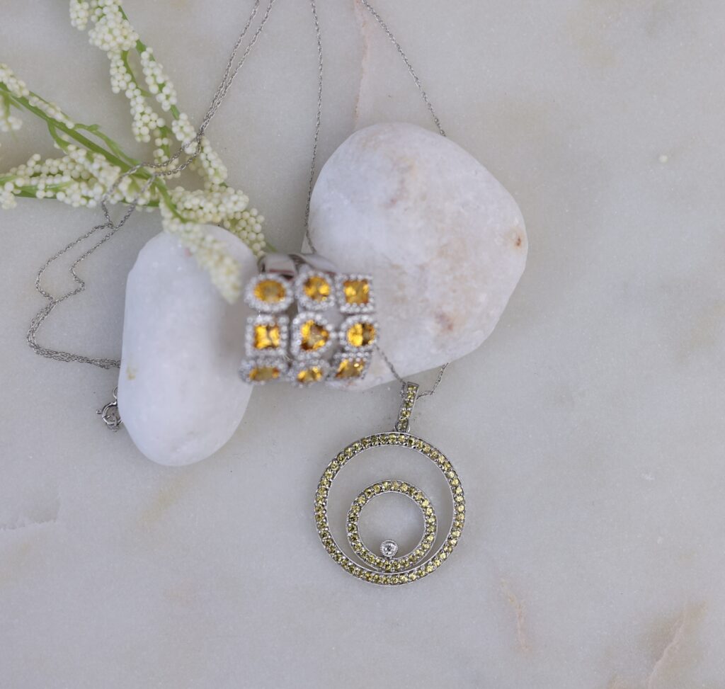 Green Apple Citrine & Diamond Pendant featuring a faceted Trillion Cut Green Apple Citrine with .03 Carat Diamond accent, VVS/F, mounted in 14K Gold with Chain