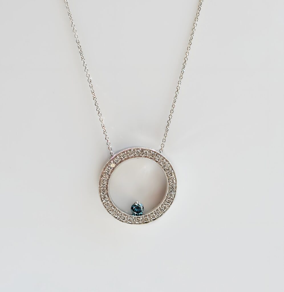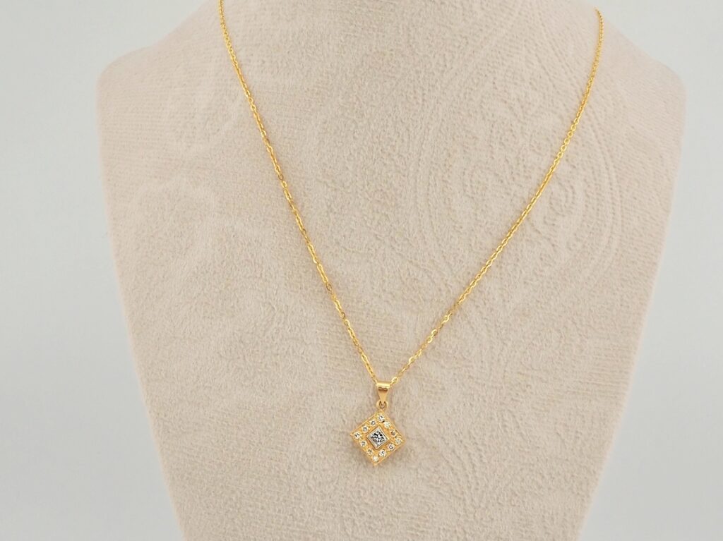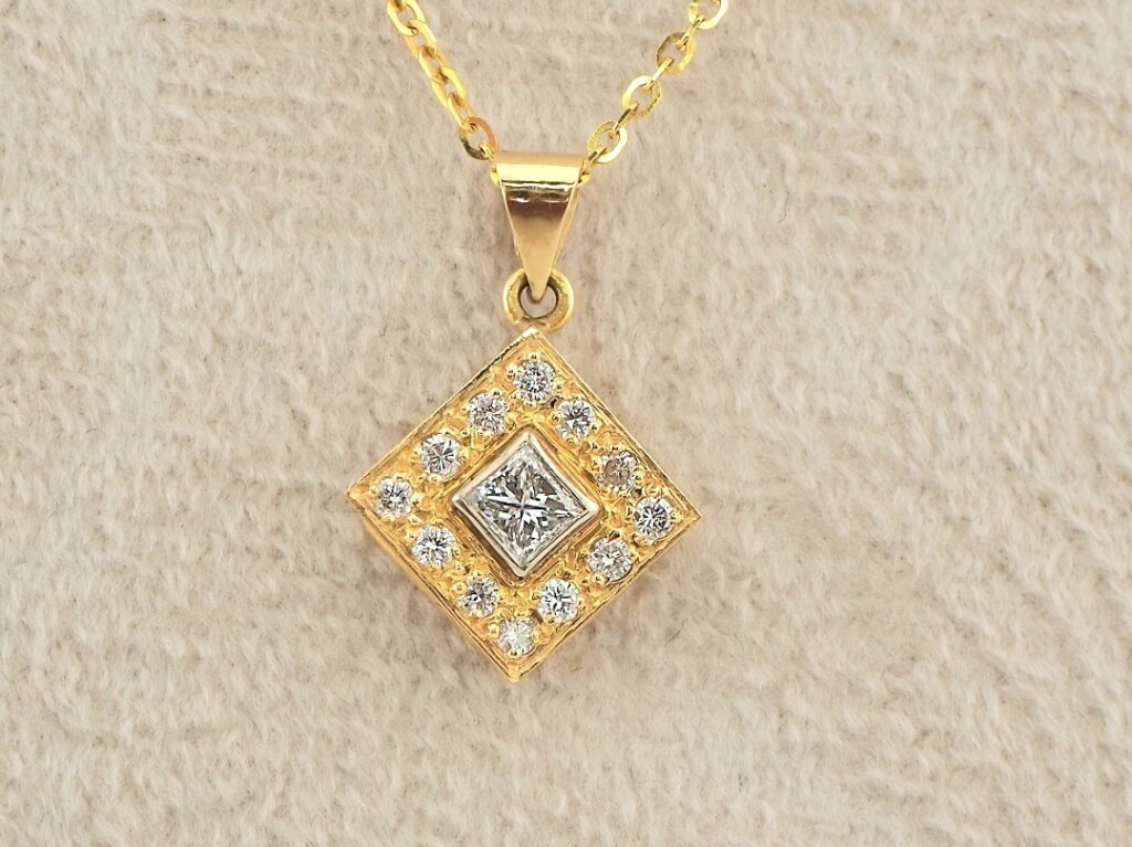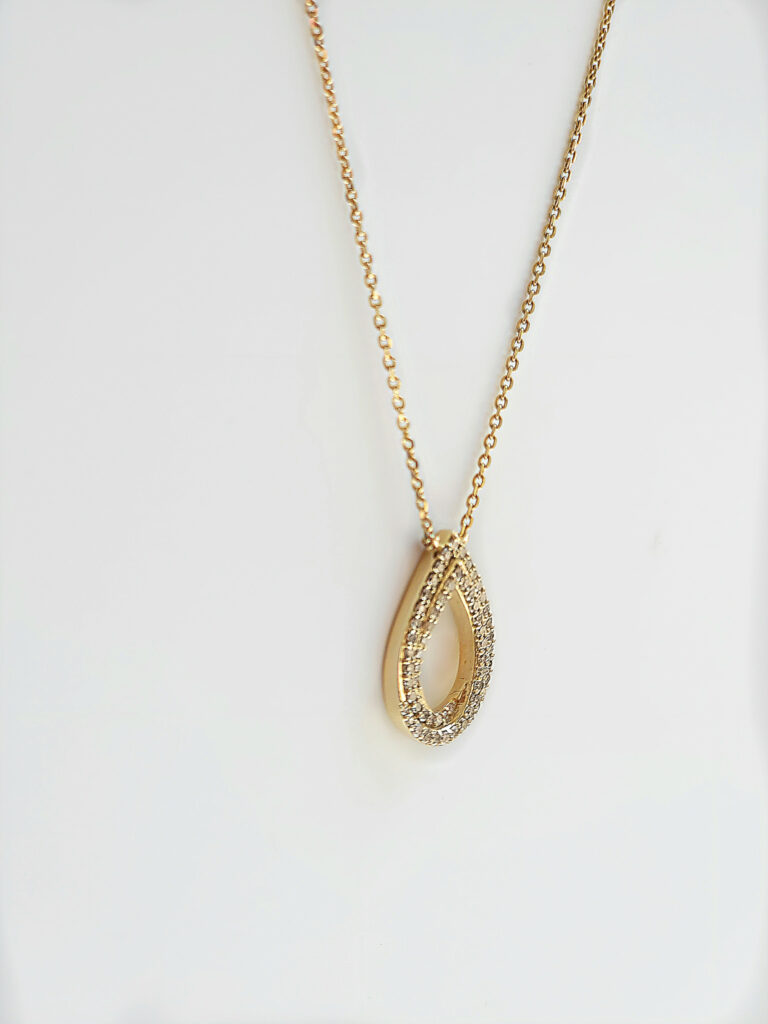 Pear Cut Diamond Pendant featuring a .43ct center stone of SI1/J quality, surrounded by an additional .14 carats TW round cut diamonds in Pavee style setting, 14K Yellow Gold. Matching Earrings available.